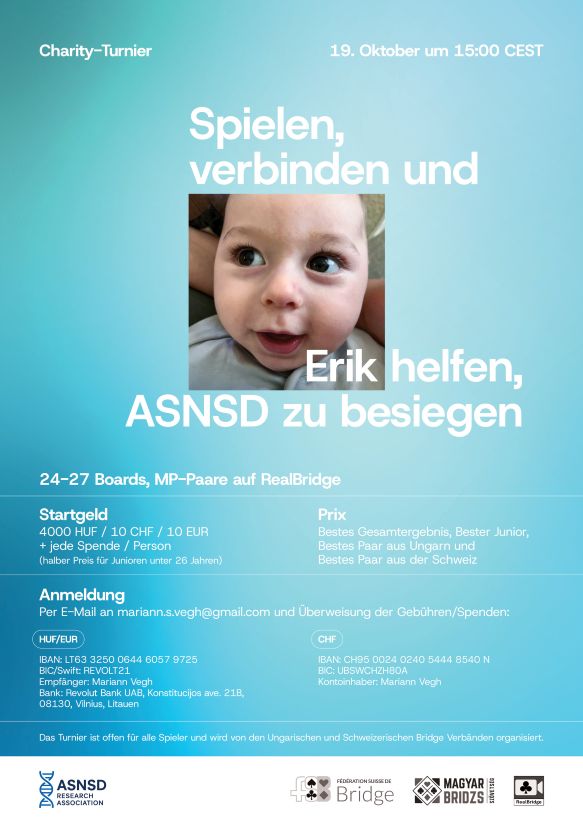 Sie können Erik und seine Eltern in dieser schwierigen Zeit unterstützen. Einerseits können Sie am geplanten Bridge-Turnier teilnehmen, das zugunsten der Familie organisiert wird. Andererseits ist auch eine direkte Spende möglich, falls Sie nicht am Turnier teilnehmen möchten. Jeder Beitrag – sei er gross oder klein – hilft, Erik eine Chance auf ein Leben zu geben und seine Eltern in dieser schwierigen Zeit zu unterstützen.
